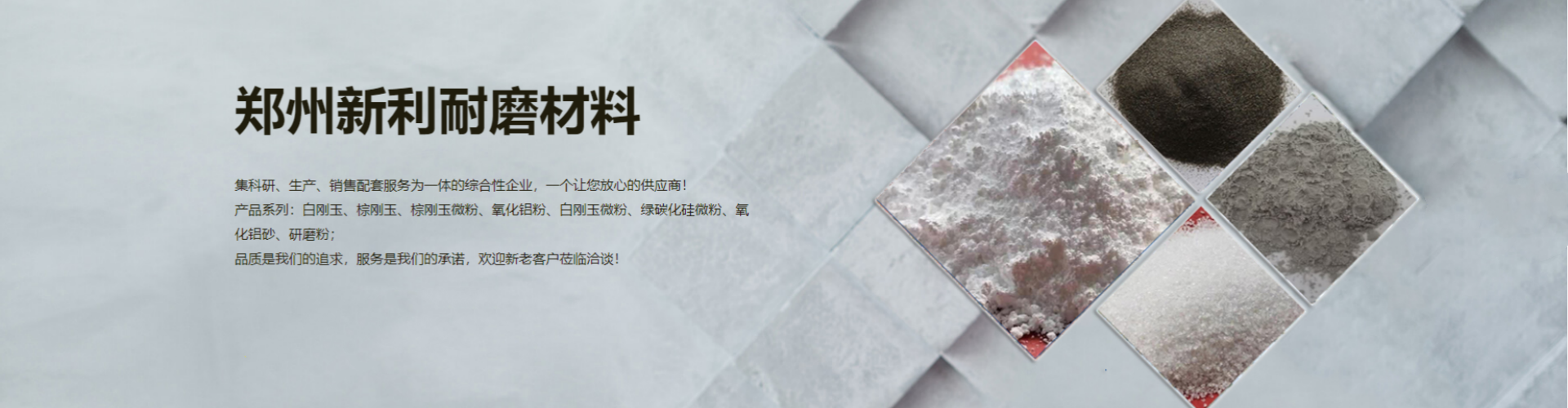 鄭州新利耐磨材料有限公司主要產(chǎn)品:包含白剛玉砂、白剛玉微粉、棕剛玉、棕剛玉微粉、 綠碳化硅微粉、氧化鋁砂、氧化鋁粉、研磨粉等多系列產(chǎn)品,為客戶提供豐富的產(chǎn)品型號(hào)及加工定制服務(wù)...
